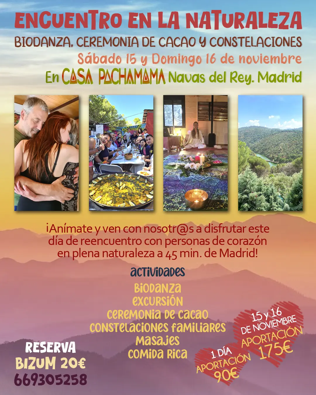 Este encuentro es una invitación a conectar contigo mism@ y con la naturaleza a través de actividades energizantes y transformadoras. En un ambiente de alegría y celebración exploraremos a través la BIODANZA y el MASAJE nuestras emociones, el momento presente y la apertura de corazón, liberando tensiones y despertando nuestra vitalidad.