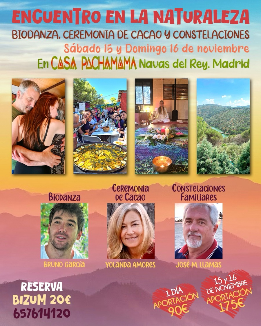 Este encuentro es una invitación a conectar contigo mism@ y con la naturaleza a través de actividades energizantes y transformadoras. En un ambiente de alegría y celebración exploraremos a través la BIODANZA y el MASAJE nuestras emociones, el momento presente y la apertura de corazón, liberando tensiones y despertando nuestra vitalidad.